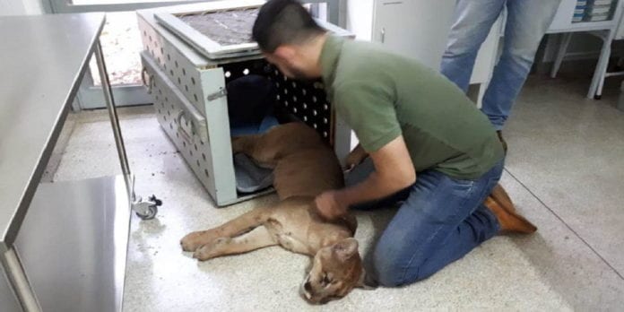 Uma onça parda, também conhecida como sussuarana, localizada numa quadra de esportes no bairro Recreio Internacional, zona Leste da cidade, foi captura pelo Corpo de Bombeiros com auxílio dos profissionais do Bosque e Zoológico Municipal Dr. Fábio Barreto, após solicitação de moradores.