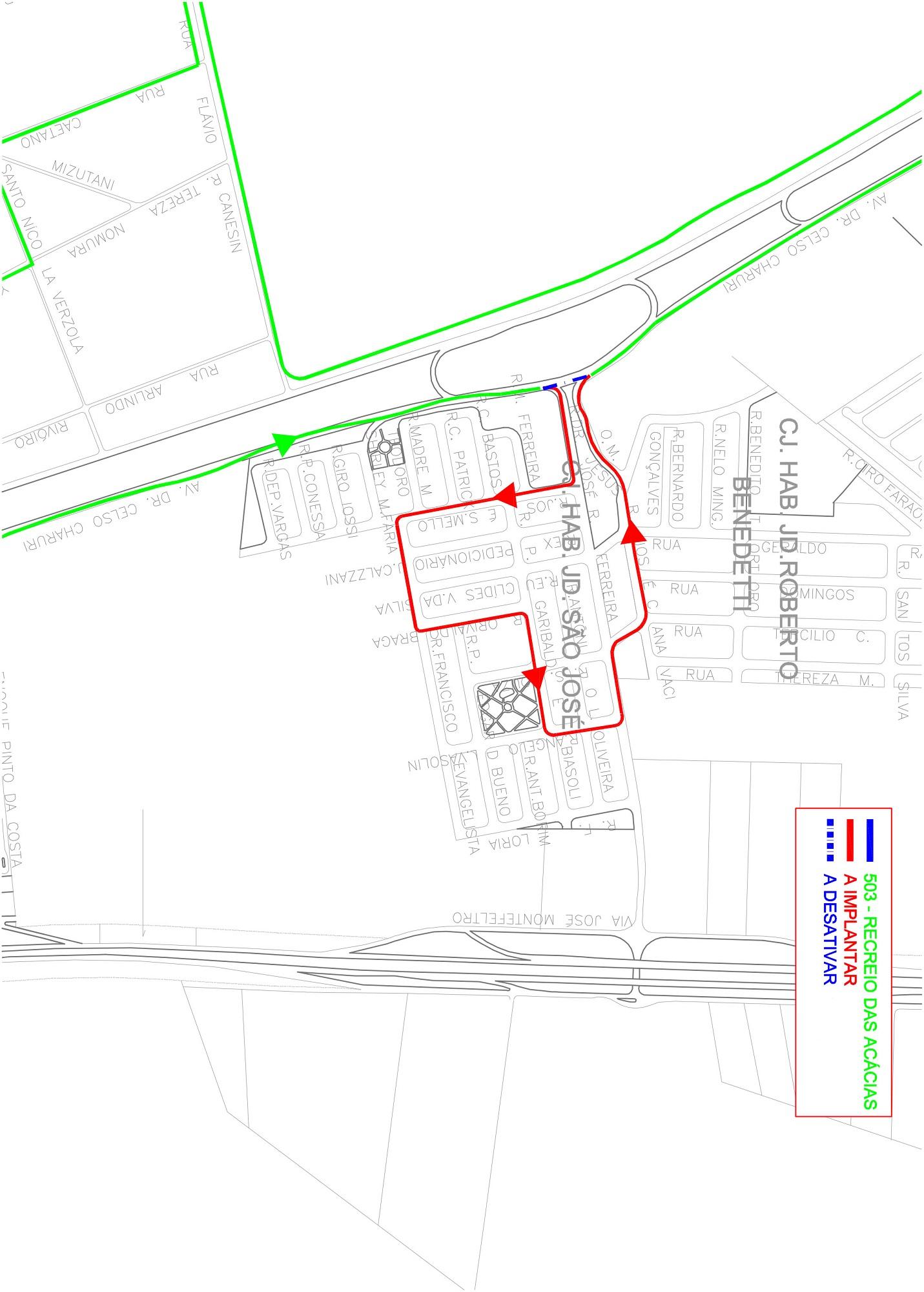 Normal até rua Dr. José Ribeiro Ferreira, seguindo pela rua Saturnino de Souza, rua Professor Garibaldi Biasoli, Terminal Sudeste, rua Ângelo Lino Vasoin, rua Dr. José Ribeiro Ferreira, retomando aí seu itinerário normal.