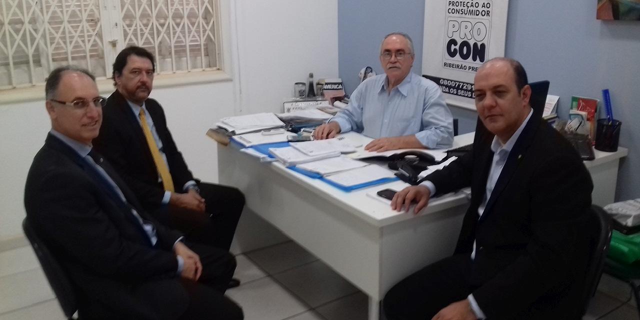 Para discutir e elaborar a pauta do encontro, o coordenador do Procon Ribeirão Preto, Paulo Garde, recebeu nesta segunda-feira, dia 6 de junho, a visita do diretor do Procon de Sorocaba, Domingos Paes Vieira Filho; do chefe de Divisão do Procon Sorocaba, José Antônio de Oliveira Júnior, e do secretário de Negócios Jurídicos da Prefeitura de Sorocaba (a quem o Procon daquela cidade está subordinado), Maurício Jorge de Freitas. A reunião preparatória serviu também, segundo Paulo Garde, para o intercâmbio de informações entre os dois Procons sobre o sistema de trabalho de cada um.