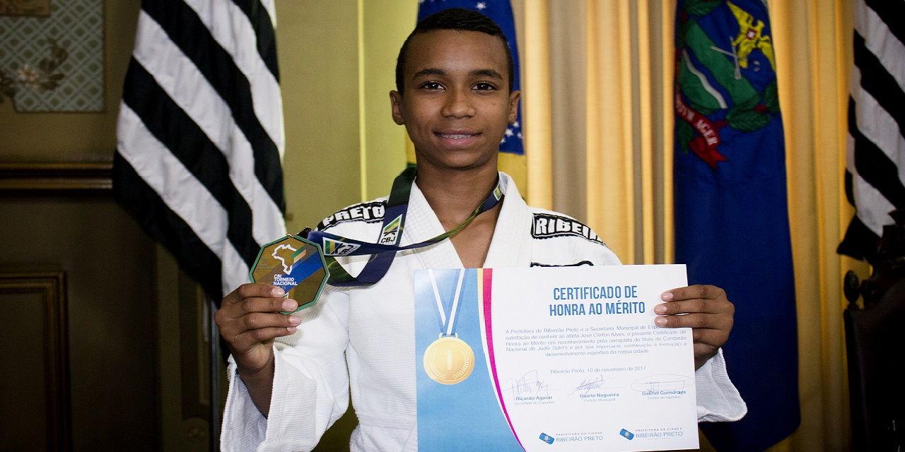 Judoca da Associação Corpore Sano/SMERP, José Cleiton Alves, 13 anos, recebeu uma homenagem na Prefeitura de Ribeirão Preto nesta quinta-feira (9), em razão do título conquistado no Campeonato Brasileiro, no fim de outubro, em Fortaleza.