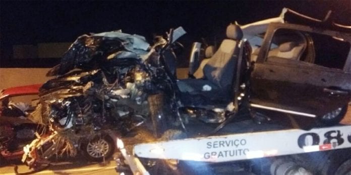 Duas pessoas ficaram presas nas ferragens e os bombeiros estão trabalhando para retirada dos feridos.