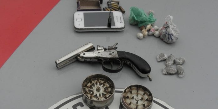A arma, munições e droga foram apreendidas.